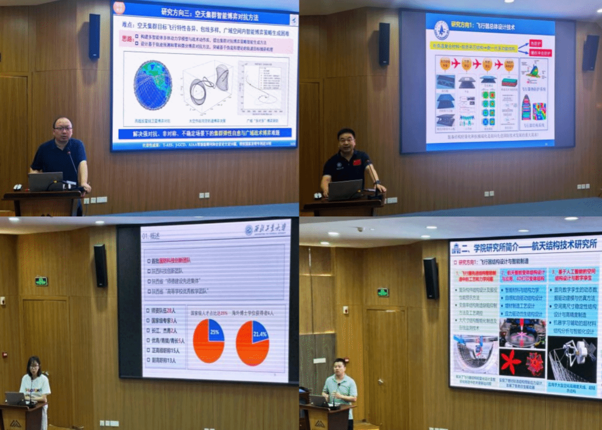精准制导与控制研究所卢晓东副教授为大家介绍了精导所在探月工程、翱翔系列微小卫星等航天重大工程取得的显著成果;空天动力技术研究所安健教授详细介绍了该所的六大主要研究方向;高速飞行器制导控制技术及飞控所李国飞副教授分享了靶标飞行器的相关技术和应用;最后,空天能源技术研究所严启龙教授对该所的重点科研攻关方向和科研条件建设进行了全面介绍。