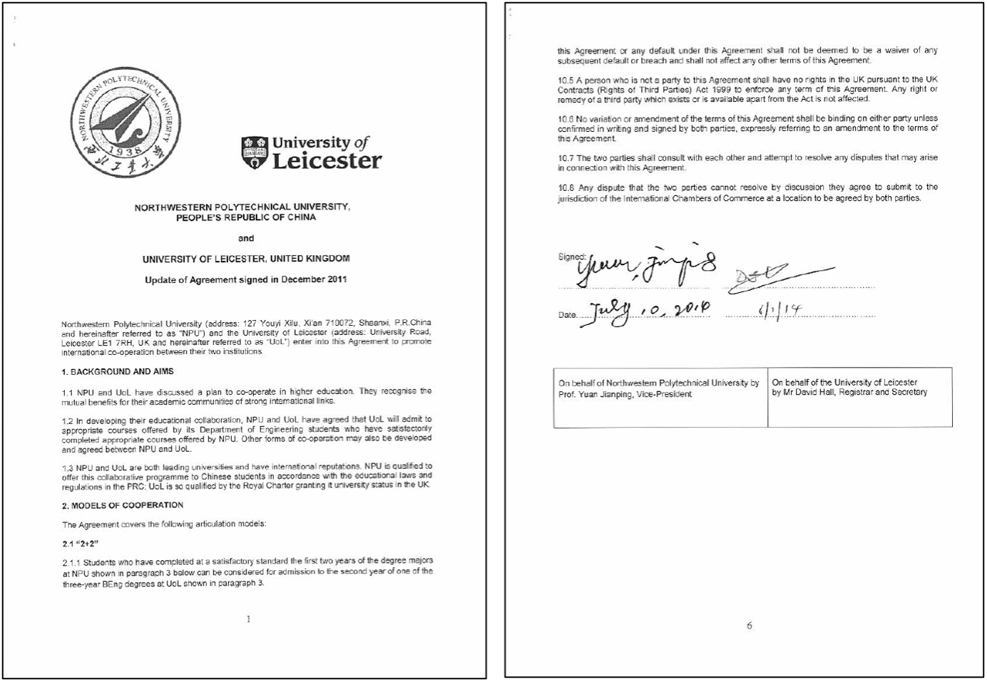 莱斯特大学-西北工业大学战略合作协议(首尾页,2012年签署,持续有效)