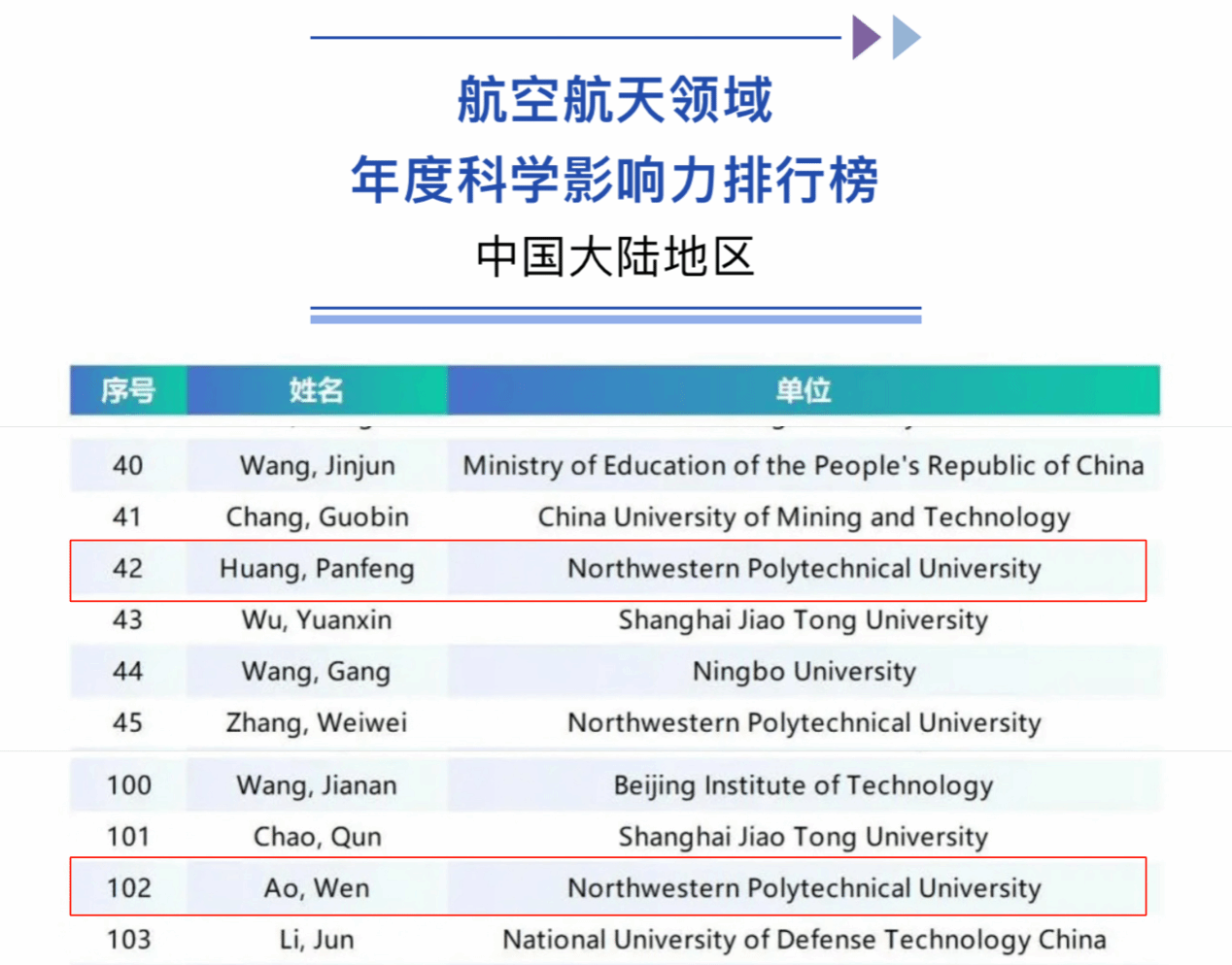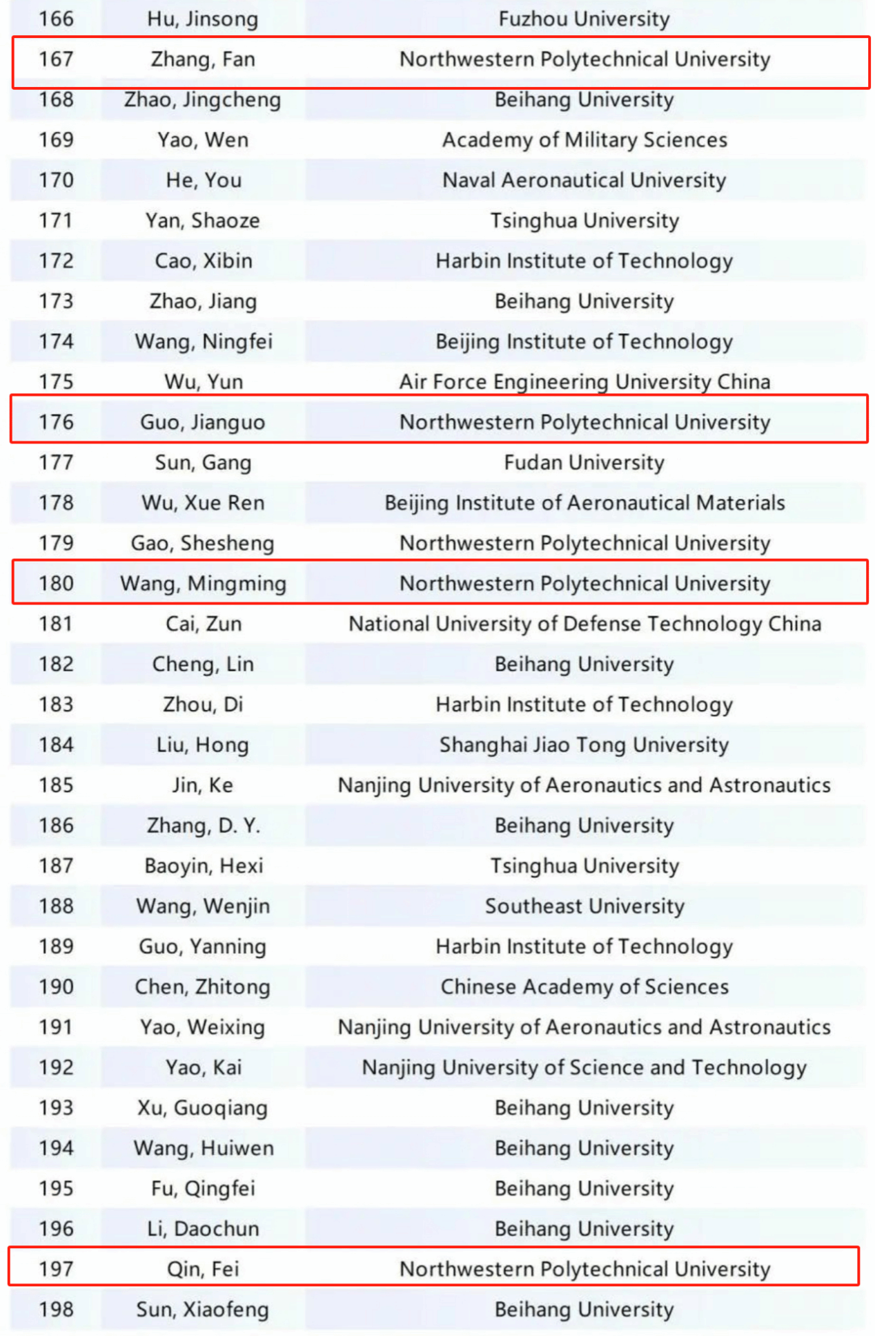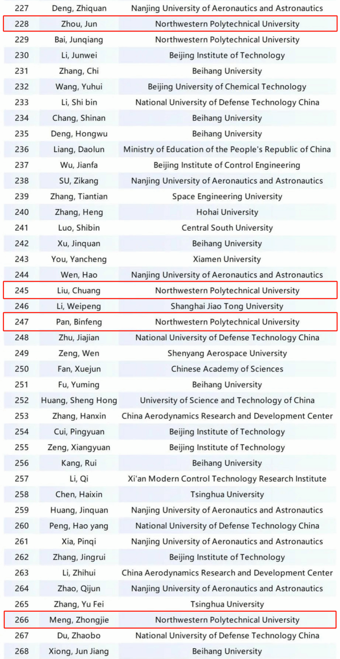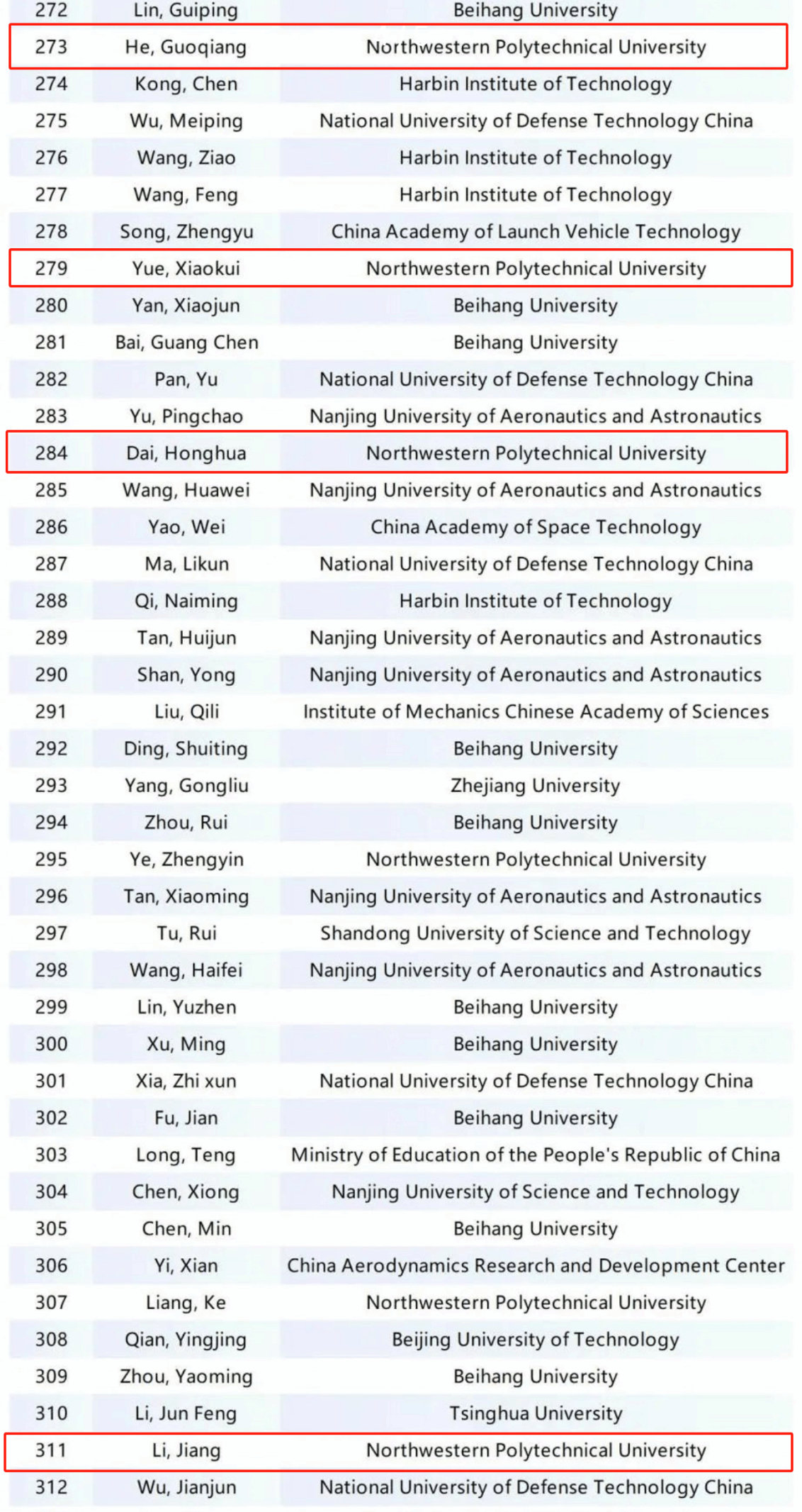 16名教师入选该榜单。其中,黄攀峰教授、敖文副教授、刘佩进教授、罗建军教授、张帆教授、郭建国教授、王明明副教授、秦飞教授、周军教授、刘闯教授、泮斌峰教授、孟中杰教授、何国强教授、岳晓奎教授、代洪华教授、李江教授同时入选航空航天领域年度科学影响力榜单。
