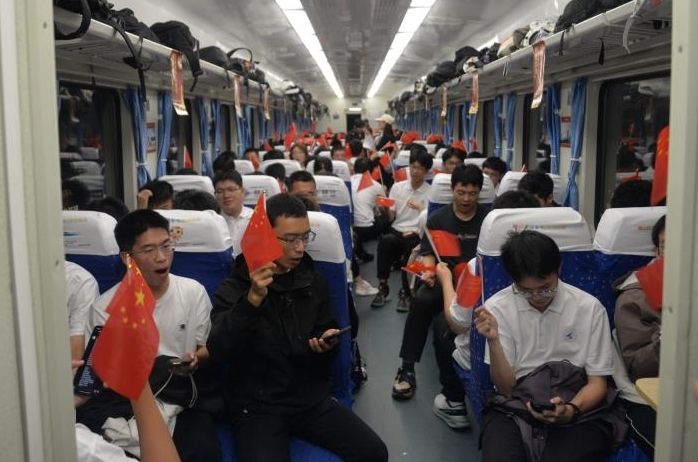 红色专列蜿蜒行于黄土地上,四海而来的同学惊叹于陕北磅礴的风光。窗外,是万里秦川,窗内,则是流动的红色课堂,车厢内,同学们齐声歌唱《歌唱祖国》和《保卫黄河》,激昂旋律与雄浑曲调交织回荡,歌声里满是青年学子对革命历史的崇敬,也让这场红色之旅更添热血与力量。